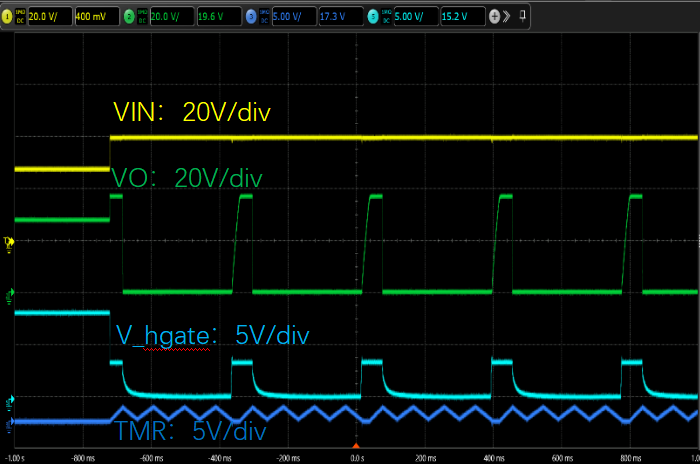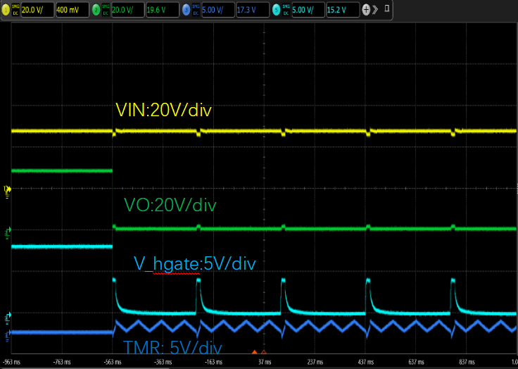 ● tmr电容选择:当fb达到1.25v时,芯片内部会对tmr进行充电,当tmr充电达到1.35v时,芯片会关断hgate驱动。若需要钳位时,保证输出不关断,则钳位时间内,tmr电容充不到1.35v,浪涌时间过会就会恢复hgate,并且不关断。
