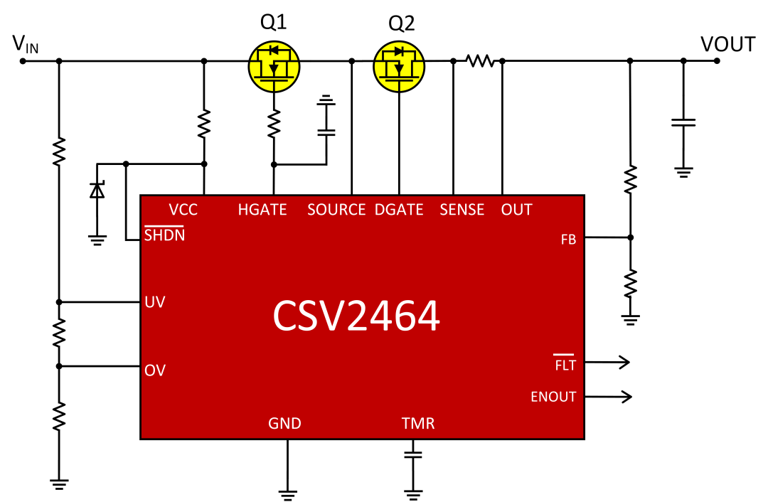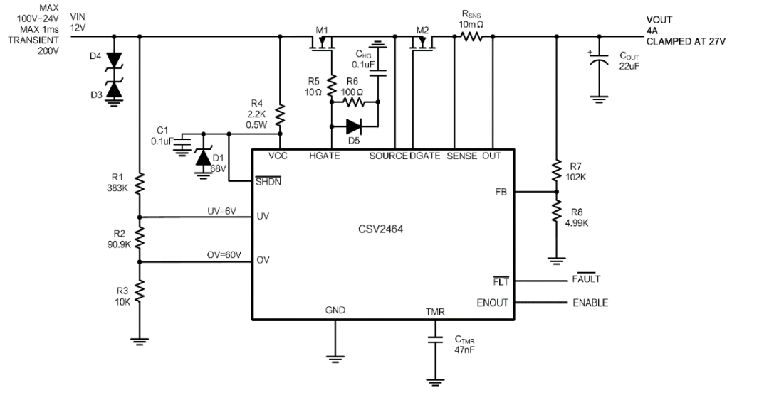 csv2464是一款集成理想二极管控制,具备“防反”接功能的浪涌抑制器。可保护负载避免高压瞬变的损坏。通过控制一个外部n沟道mosfet传输器件两端的电压降,该器件可在过压过程中限制和调节输出。csv2464还包括一个定时的电流限制电路断路器。在故障情况下,一个可调故障定时器必须在传输器件关断前结束,csv2464将在一个延迟后自动重新启动。csv2464可精确地监视输入电源的过压和欠压情况,外部mosfet在欠压状态下保持关断。应用框图如图2所示。